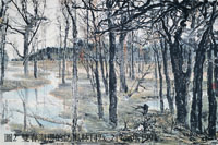 目光依循著由左方浸在海水裡載浮載沉的枝掗,經橫躺於水邊沙岸之間的枯樹殘骸、孤立樹、沙灘,但見壯闊的木麻黃林聳立於中央偏右部分,佔了整個畫面的三分之二 ; 右方由一棵枝掗奇出、多姿,壯碩、蒼勁的木麻黃上場,與松相較,不遑多讓,經一兩株禿樹,也進了主體樹林。前景焦點所在的樹木,截去樹梢顯其高,猶如強有力的黑武士般矗立於陣中,最能「奪目」「懾人」的便是這一幕戰陣般的樹林,沒有人逃得過這股先聲奪人的震撼力。左右兩方的佈局,所引導出消失於遠方的樹林、綿延不盡的沙岸、無限的海與天空 ; 透光的表現手法與遠處陽光籠照著樹林,深遂奧秘,均是在領受過「震撼力」後,必然會遁入的心靈之境 ; 風在林中回盪,海浪不止息的拍打著沙岸,風濤與海濤交響著歷經千古的「寧靜」,扣住了心弦。