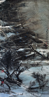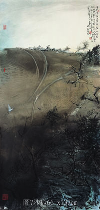 使人驚嘆的「渾然天成」又可見諸於畫家本身是如何自在的操演著這些「偶然性」的墨色紋理效果之作品中。「水與墨」奔流後所產生的留白、飛白、白痕,有些甚至僅有幾許白點或幾絲白線,畫家援引之為亮光,於其處率意畫之為掩於沙中或橫臥於沙灘上的木麻黃枯枝枯幹,或畫為殺上的碎石粒堆,於畫面明暗對照效果的運用,造就了「沙灘上的碎石堆」(圖10) 中遼闊空曠的沙洲上出奇的寂靜 ; 隨意勾畫皴染而成遠