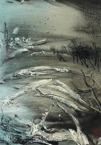 沒有預設構想,就從每一幅「水與墨」所形成全然不同的情境、不同的天地開始,畫家駕馭著有如脫韁之馬的靈思,奔馳其中、沉浸其中,追循著 ; 水墨走過的痕跡,任由圖像湧現,意寫、再造防風林有如「傳說般」的新境 :「風沙起兮」(圖6)是沙洲逗玩著海水,抑是海水戲弄著沙洲 ? 水帶著沙,沙順著水快速奔流,寫下乾濕殊異、生動莫測的畫境,遠處拉高的地平線土上稀疏的木麻黃,簡潔、不可或缺的關照著這瞬間而起卻生生不息的遊戲。於沙洲上上演的戲碼,,隨興之所至導入了不同的角色,「沙痕」(圖7)引來一隻好奇的白鷺,又是誰多事 ? 在沙洲上略下幾道白痕,呼應以右邊幾根奮起的黑色枝條,管他風吹沙如何,終究得還給沙洲本有的「靜謐」;「沙洲映餘暉」(圖8)中,水沙痕更有微妙的變化,柔軟細緻無比,隱約中似見幻化般的倒影。木麻黃也來軋一角,是沙洲掩其足,或是它躲進了沙洲 ? 綿密的詩意也好,對變幻無常傷感也罷,畫家譜下瞬息的現象 !「歸」(圖9)